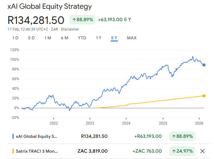 Below are the Aggressive (xAI Global Equity Strategy) vs Conservative (SATRIX TRACI) strategies over 6 months and 3 years