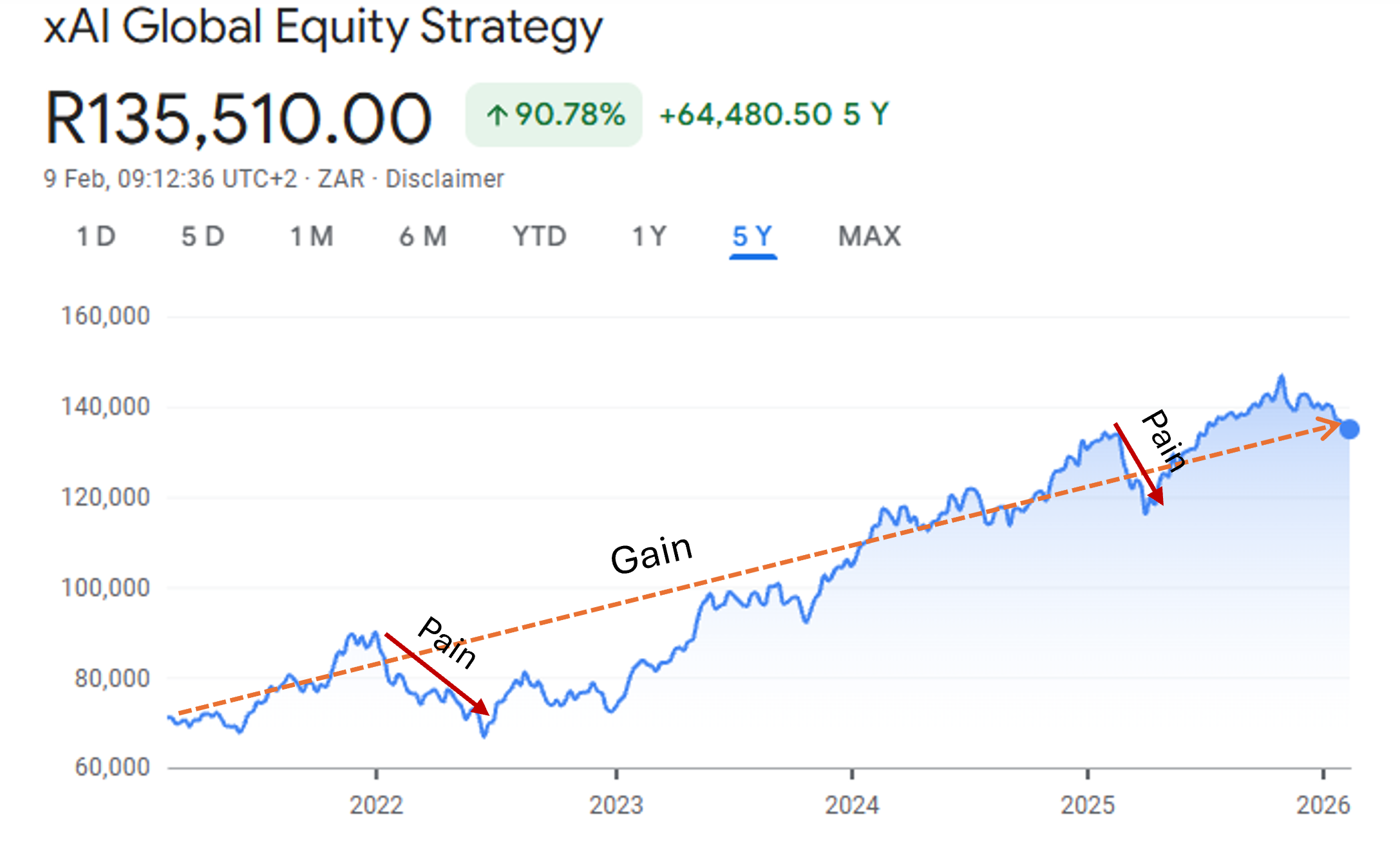 Markets tend to go up over long periods, but with lots of bumps (losses) along the way. An aggressive investment strategy (xAI Global Equity) demonstrates this. Over 5 years, it grew from around R70 000 to R 135 000 —that's almost +90% gain (almost doubling your money) - This is the GAIN function. During shorter periods, it lost money (PAIN function). For example, it showed big losses for 6 months in 2022 and again in 2025.